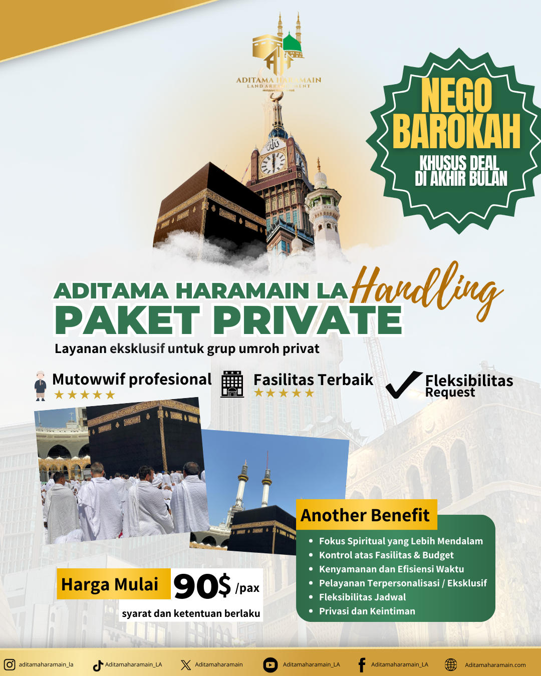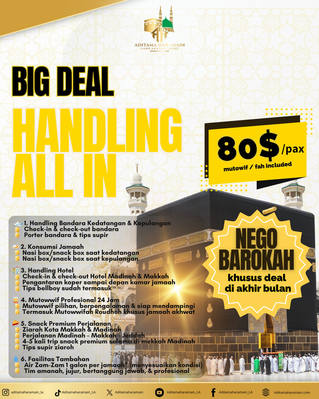 Aditama Haramain bekerjasama dengan travel di Indonesia dengan Harga Bersahabat, menghadirkan layanan handling terbaik di Makkah dan Madinah. Kami siap mendampingi jamaah mulai dari penjemputan, akomodasi, konsumsi, hingga bimbingan ibadah agar perjalanan suci menjadi lebih tenang, nyaman, dan penuh berkah. Dengan pengalaman dan tim profesional, kami berkomitmen memberikan pelayanan yang ramah, aman, dan terpercaya untuk setiap jamaah.